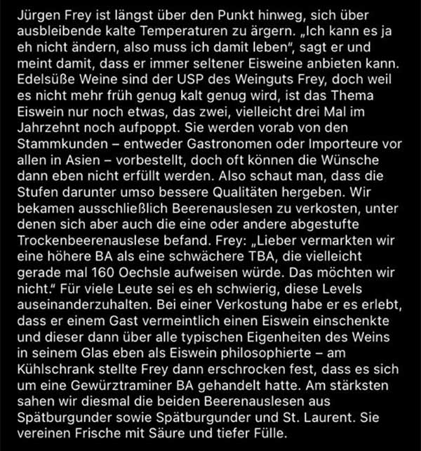 Was auch an der besser hervorgebrachten Säure liegen mag, die den Weinen guten Schliff gibt. Uns hat es, neben den Eisweinen, besonders die Spätburgunder Trockenbeerenauslese angetan.